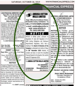 Notice is hereby given that a Board Meeting of the Directors of the company to be held on Friday, 08th November 2019 at the Registered Office No – 9 A, Valluvar Street, Sivanandha Colony, Coimbatore – 641012 of the Company at 12 noon.