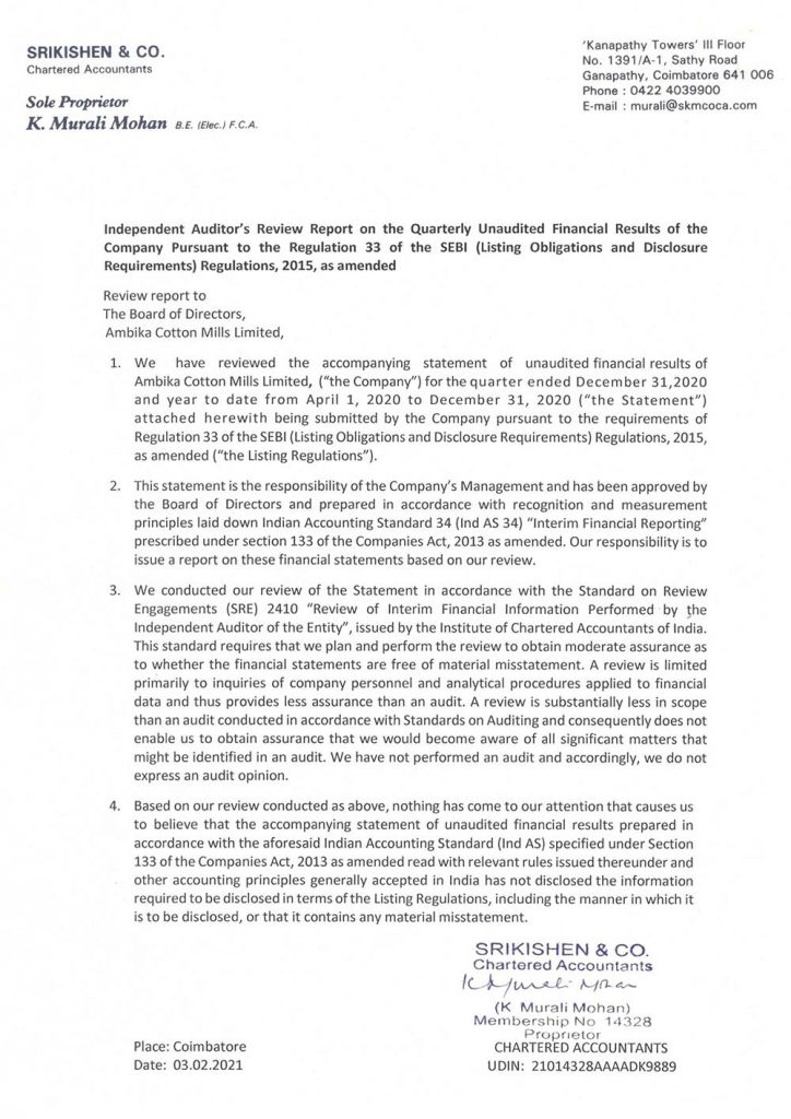 Please find enclosed herewith a copy of Unaudited Financial Results, and Independent Auditor’s Review Report for the Nine months / Quarter ended 31 December 2020, which was considered and taken on record by the Board of Directors at their meeting held on 03.02.2020.