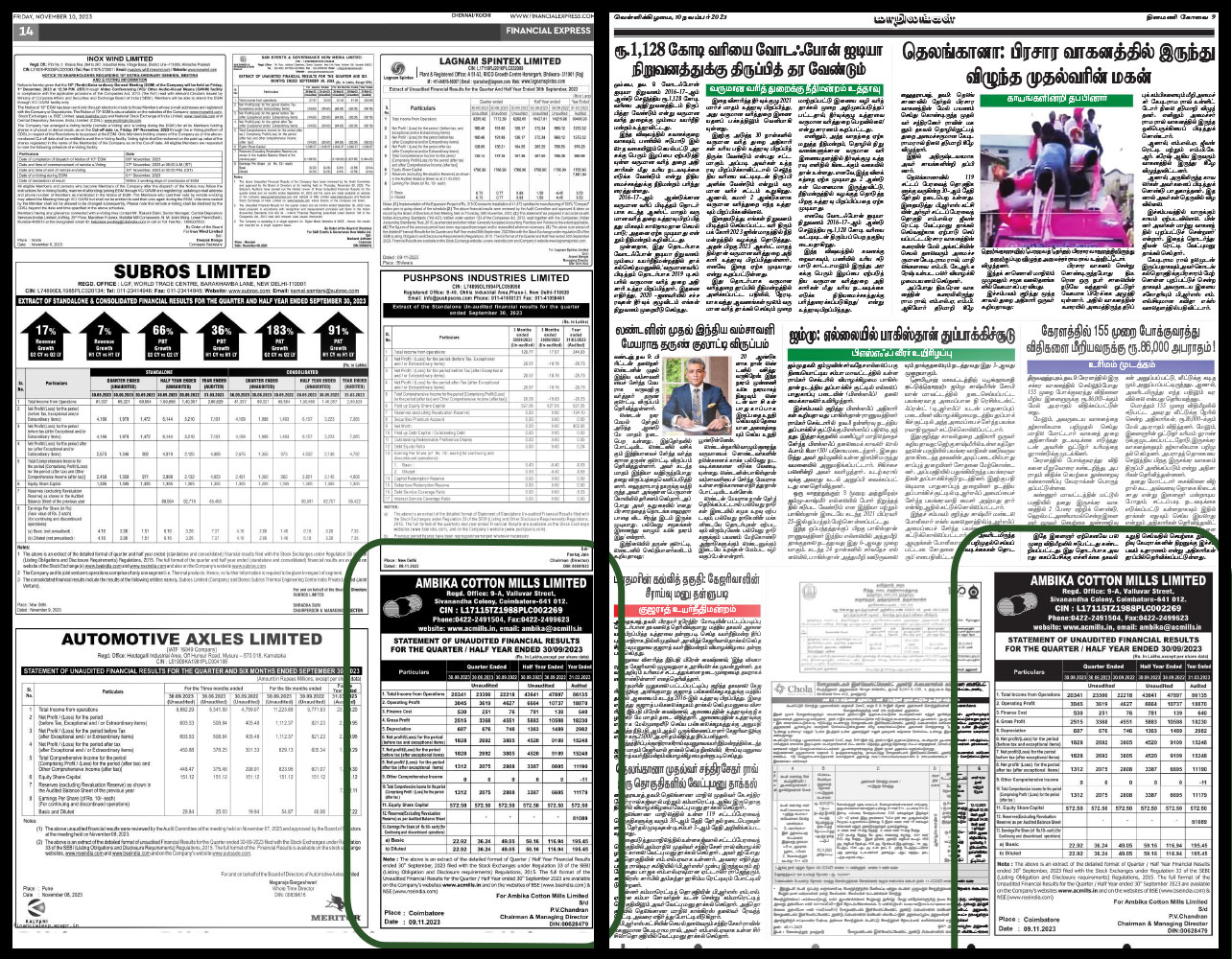 Links News Articles The Unaudited Financial Results Q2 2023-2024 in Dinamani and Financial Express Published 10 November 2023
