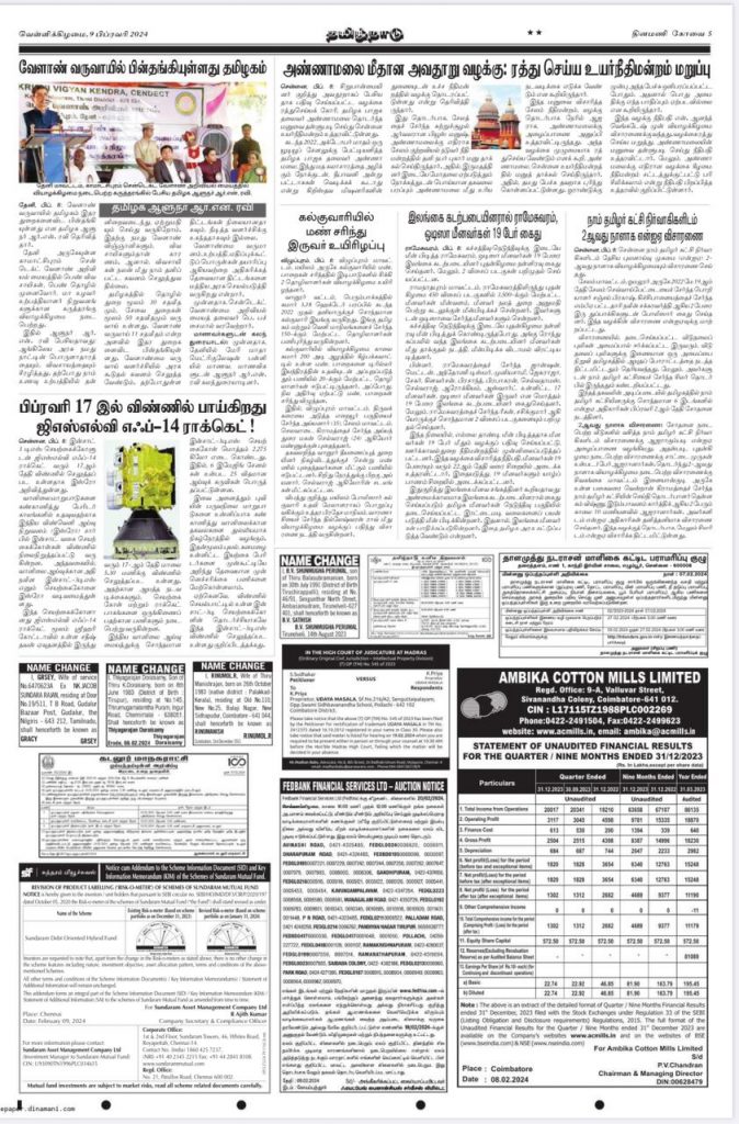 Links News Articles The Unaudited Financial Results Q3 2023-2024 in Dinamani and Financial Express Published 09 February 2024